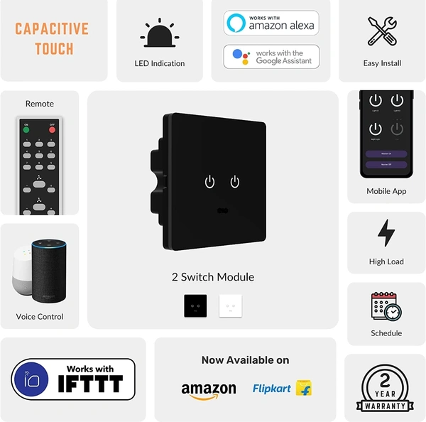 - Elegantly designed Smart Wifi Touch Switches with tempered glass panel that work using capacitive touch technology.