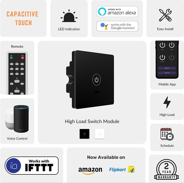 Smart WiFi Touch Switch for Single High Load (AC/Geyser) with Touch Control, IR Remote, Mobile App, Google Assistant, Amazon Alexa & Google Home Voice Control for Smart Home Automation (Black Variant