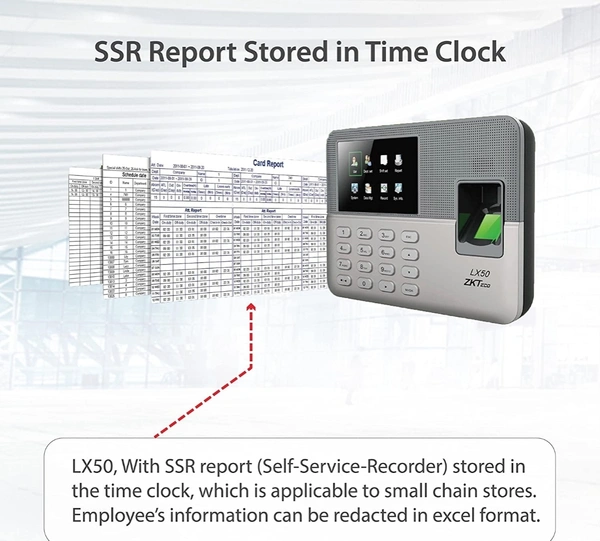 ? SSR Function?Self-Service-Recorder stored (SSR report) in the time clock, which is applicable to small chainstores,small business ect.Employee' s information can be redacted in excel format